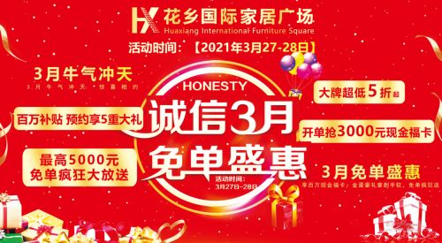 3月,花乡国际家居广场免单盛宴开启,快呼朋唤友,一起相约领取5重大礼。