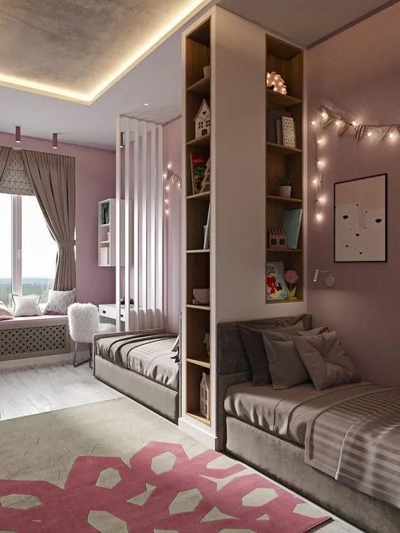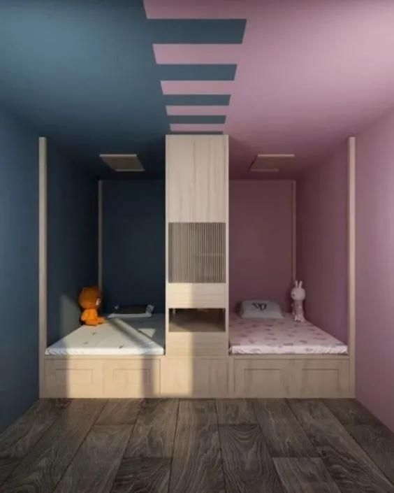 当然,你要是觉得在中间打造柜子过于复杂的话,也可以在两张床中间摆放隔板,这很适合小户型使用。