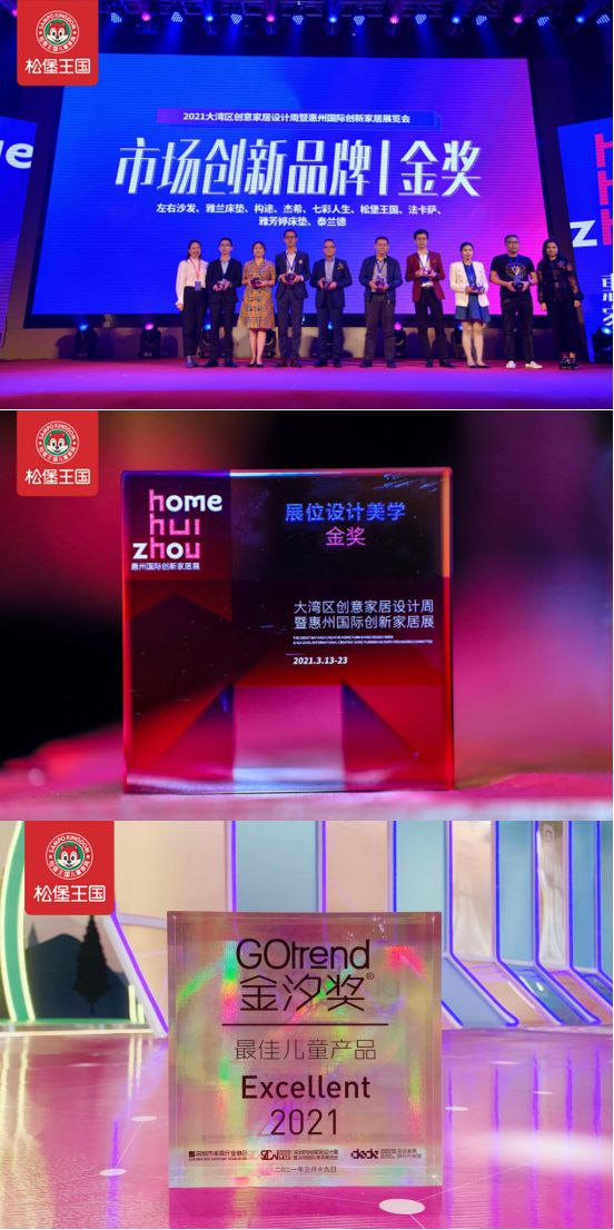 以创新,引领行业变革!松堡王国拥有强大的设计研发和品牌营销团队,此次展会创新推出“儿童空间进化论”新概念,并亮相12个不同主题的系列空间新品,在惠州国际创新家居展创新评选中,松堡王国一举斩获两大金奖:展位设计美学金奖&市场创新品牌金奖。同时,2021新品【冰雪小屋】以最佳儿童产品斩获第七届Gotrend金汐奖,松堡王国连登家居设计界荣誉巅峰!
