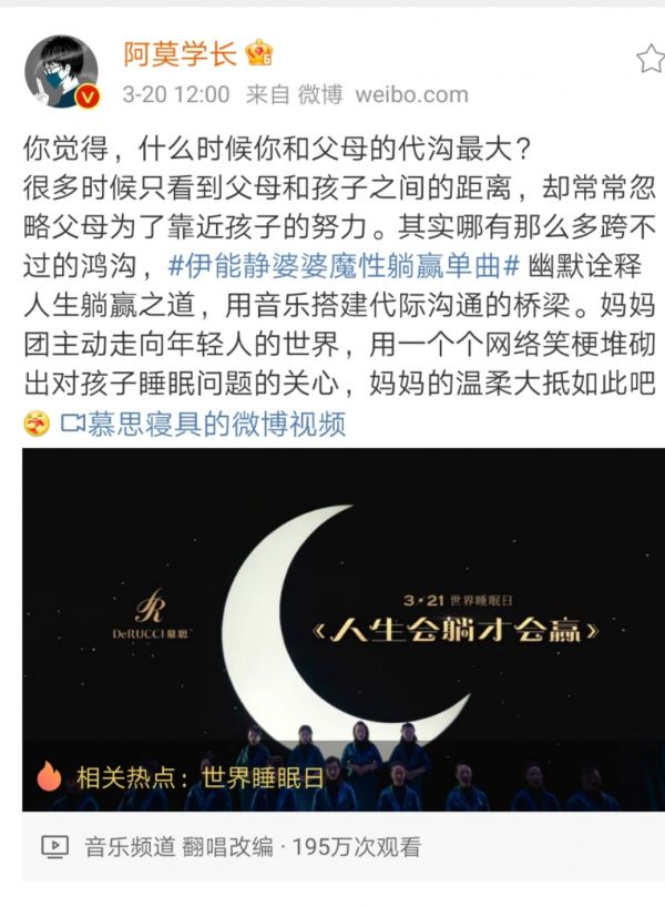 父母未尝不知子女的艰难,知乎上曾有个提问,大意是“如何科学地让孩子早点睡觉,又不会让他感觉很烦”, 这一次,慕思联合31位妈妈给出了个好点子。她们重新改编耳熟能详的摇篮曲,融入年轻人喜欢的说唱,努力用更年轻的方式去表达爱。