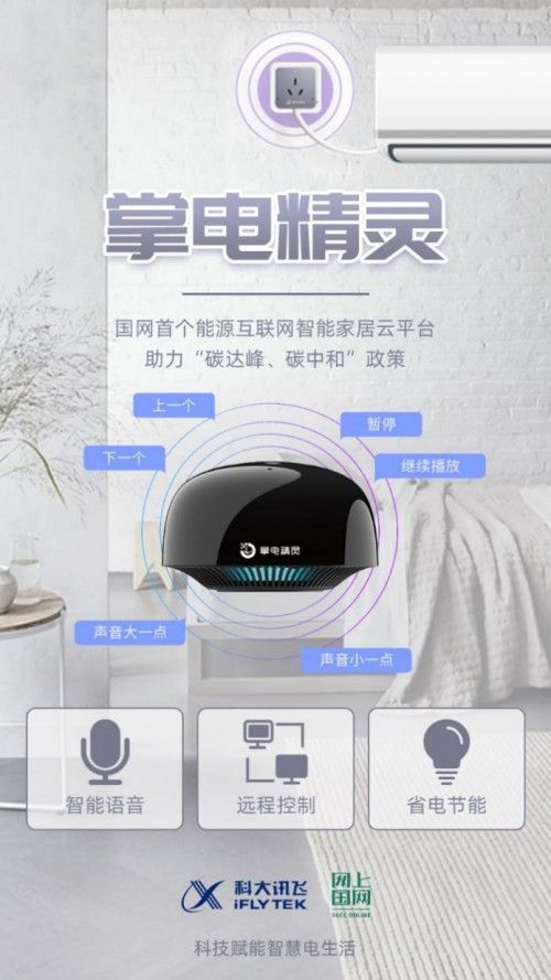 “掌电精灵”是网上国网、国网厦门供电公司、科大讯飞股份有限公司和合肥飞尔智能科技有限公司四方合作,聚合电网企业、电商,家电厂商,物联网厂商优势,共同构建的厦门城市能源互联网客户侧智能家居平台。“掌电精灵”智能家居平台能够实现传统家电的物联网和智能化,采用智能语音、远程控制、省电节能三大性能于一体,从云、端、标准、生态四个方面,解决传统家居行业用户面临的体验痛点,将用电大数据采集由过去的以户为单位缩小到以用户侧的用电设备为单位,为用户能效管理和需求响应等工作精准赋能,给家家户户带来家居智能管控全新体验。