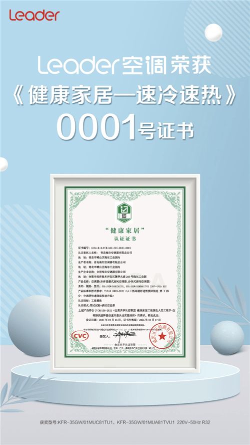 在3月23日开幕的2021中国家电及消费电子博览会(AWE)上,Leader发明“最快”空调——旋翼耳机空调,开机6s出风口吹出热风,40s出风口温度达到38℃,快速冷热获颁《健康家居-速冷速热》第0001号证书。据悉,该认证由金质共享认证联盟联合威凯认证检测有限公司、中国标准化研究院、京东家电发布,Leader是首批通过认证的家电。