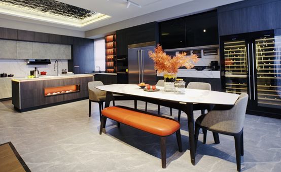 浪荡于江湖、寄情于山水。墨戏会的中厨餐边区使用联动的四扇移门与烹饪区进行空间隔断,搭配咖色哑光金属层板和内置电力轨道的反弹设计抽屉,操作区高低分离,采用氛围灯与照明灯结合的灯光系统;一站式解决小家电的操作和收纳问题,高低操作区设计与抽屉内置电力轨道使操作更加便捷,释放出更多的操作空间;西厨区设计背墙系统、操作台面及嵌入式蒸烤箱,可以解决简单的早餐,轻食,以及烘焙。层次丰富真实,打破空间的沉闷,让空间更加充满生趣。
