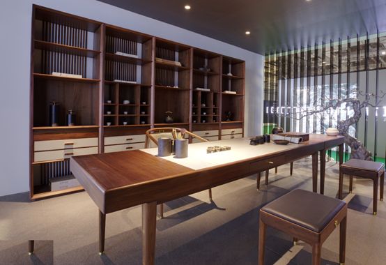 接着是另一大至简国风佳作——墨戏会。墨戏,顾名思义,即以墨为戏之意,彰显自由、多样、不拘形迹的洒脱,让人不禁想起大文豪苏轼,肆意、洒脱的性情、清远旷达的人生。墨戏会便是这样的存在,整体采用玄色与赤色作反色处理,在主体为深色调的空间中,搭配哑光质感的红色,提升设计感。融入千里江山图的设计,风格以轻奢为主,添加中式元素,使空间设计更加符合年轻人生活,针对中国消费者实用习惯进行设计。取挥毫泼墨之意,体现墨戏文人的肆意,为客户提供回家后舒适,自在、放松的生活环境。