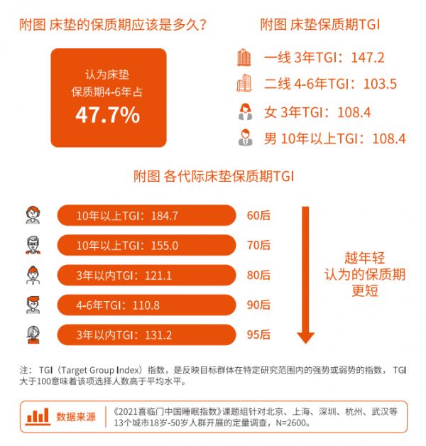 今年,报告在描绘出国人睡眠画像的同时,也洞察到国人对于更换床垫的迫切需求。数据显示,78.5%的消费者认为床垫需要保质期。47.7%的消费者认为床垫的保质期在4-6年,认为床垫保质期在10年以上的仅占12%。同时,一线城市消费者认为床垫保质期应该设定为3年;二线认为床垫保质期应该是4-6年。
