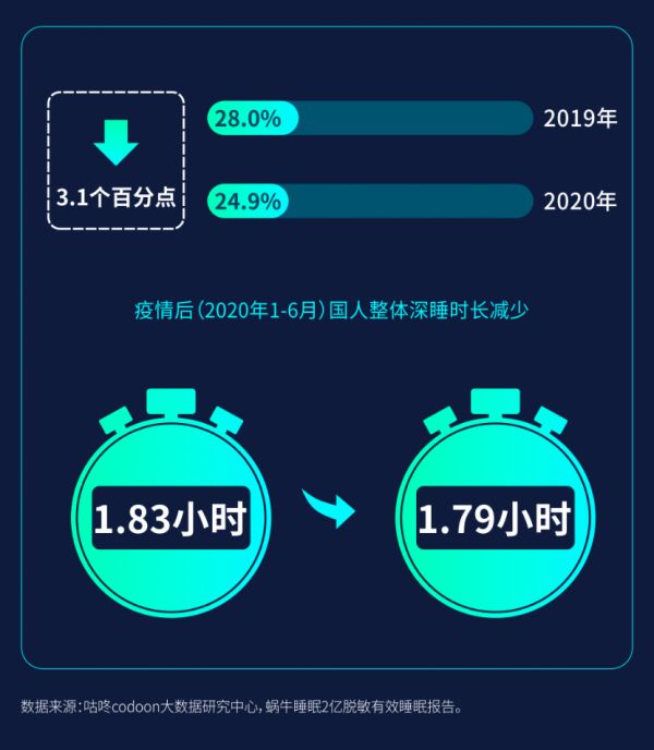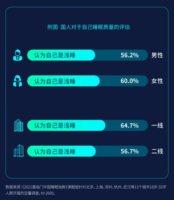 报告显示,国人深睡远不够达标,2020年达到深睡的人群占比不足24.9%,平均深睡时长仅为1.79个小时。其中,58.5%的中国人认为自己睡得浅。