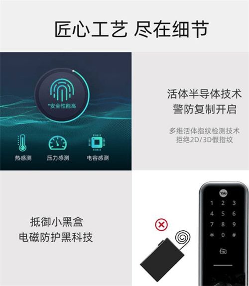 耶鲁智能锁采用了先进的FPS半导体活体指纹识别技术及防指纹触摸屏,反应更加灵敏的同时,真正做到 0 残留指纹,有效防止复制指纹,轻松实现拒绝假指纹。同时,采用了目前最先进的虚位密码的模式,在正确的密码前后输入一定的数字都可以开锁的方式,成功实现了防偷窥等功能。