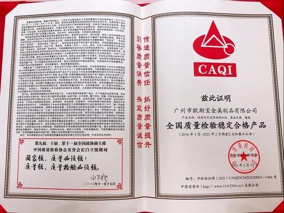 3.15日,广州市欧斯宝金属制品有限公司在中国质量检测协会组织的2021年“3·15”国际“产品和服务质量诚信承诺”主题活动中,一举获得“全国产品和服务质量诚信示范企业”和“全国顶墙定制行业质量领军企业”和“全国质量检测稳定合格产品”等三项殊荣!