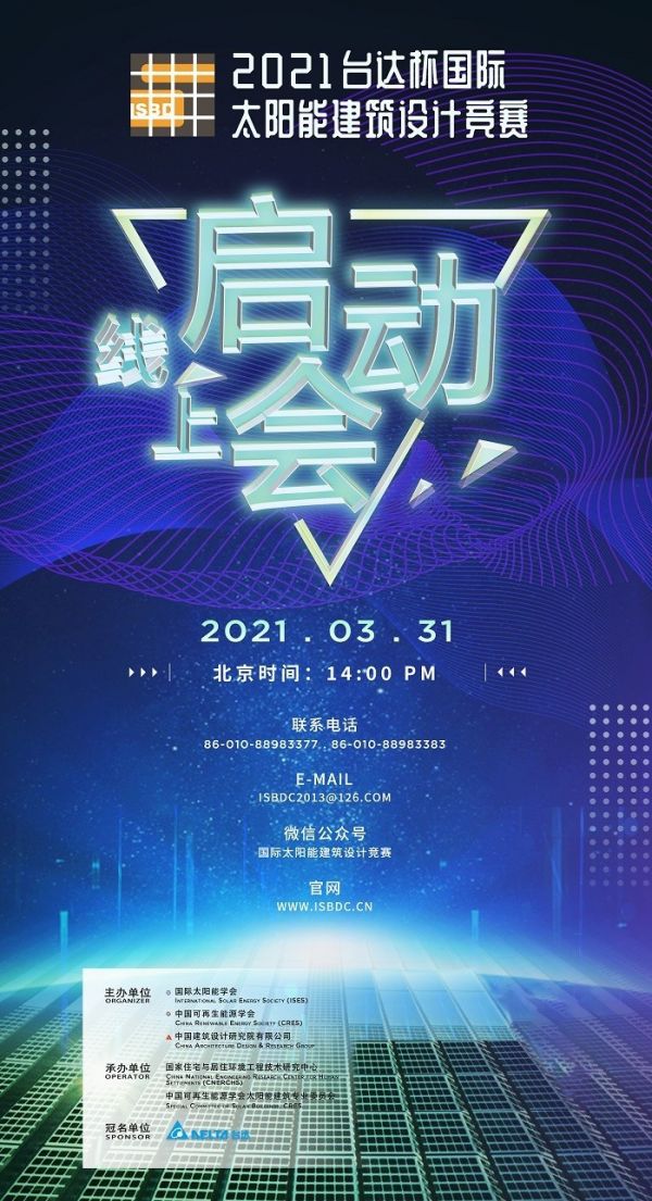 由国际太阳能学会、中国可再生能源学会、中国建筑设计研究院有限公司主办,国家住宅与居住环境工程技术研究中心、中国可再生能源学会太阳能建筑专业委员会承办,全国高等学校建筑学学科指导委员会技术指导,台达集团冠名的2021年台达杯国际太阳能建筑设计竞赛空中启动会将于北京时间2021年3月31日下午两点正式启动!启动会采用线上直播的方式,数位业界大咖齐聚直播间,与您“面对面”交流互动(参与方式见海报或关注 国际太阳能建筑设计竞赛 微信公众号)。