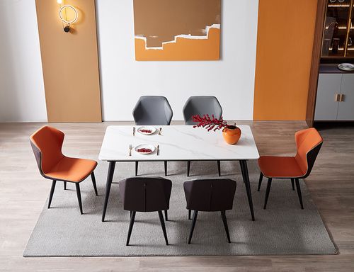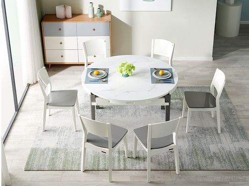 全友家居意式极简岩板餐桌,采用高品质岩板台面搭配质感金属框架,外观轻奢雅致;岩板台面的莫氏硬度高达7级,不惧尖锐器具刮擦并且环保健康,可以直接在桌面切菜、切水果。岩板于上千度高温环境中制作而成,不惧高温高热,可直接放置热锅;另外高密度特性让污渍难以深入,近乎为零的吸水率,一抹即净好打理。