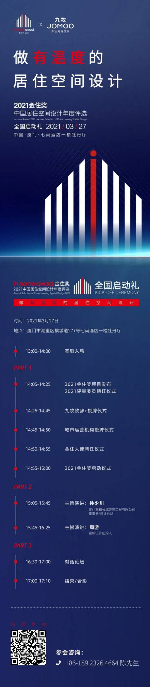 此次活动重磅邀请了厦门嘉和长城装饰工程有限公司董事长/设计总监孙少川、更新设计创始人、九牧联名设计师周游作为主旨嘉宾出席,他们将共同探讨居住空间设计与“温度”的关系。