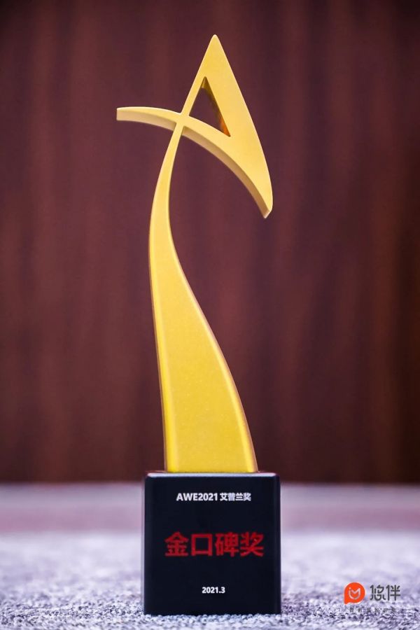 AWE艾普兰奖素有全球智慧生活领域“奥斯卡”之称,入围门槛高、覆盖面广、参选品牌多,是国内乃至国际上最具公信力的产品评选表彰活动,选出的产品均代表年度行业新品的最高水准和最新技术走向,竞争异常激烈。艾普兰“金口碑奖”因是通过大众网络投票,以良好口碑为重要条件而成为最代表消费者民意的奖项。此次荣获该奖,是行业权威对悠伴产品创新的高度肯定。