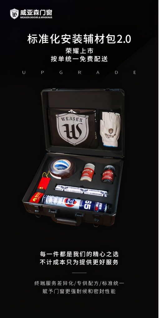 为解决安装标准缺失带来的弊端,威亚森门窗甄选了综合实力强、具备技术专长的辅材企业达成战略合作,长期为我们专供定制配方辅材,并整合为威亚森标准化安装辅材包2.0,免费配送给终端使用。