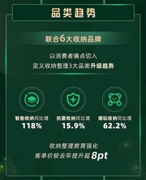 在3月宜收纳活动中,天猫家居针对精致妈妈、新锐白领、资深白领和小镇青年为主的收纳人群,分别发布“智能收纳、抗菌收纳、潮玩收纳”三大收纳趋势以及代表性好物种草,满足消费群体从“整理在一起”转为“高品质分类”的收纳需求,并在“智能、抗菌、潮玩”等方面,增强品牌与消费者的沟通效率。