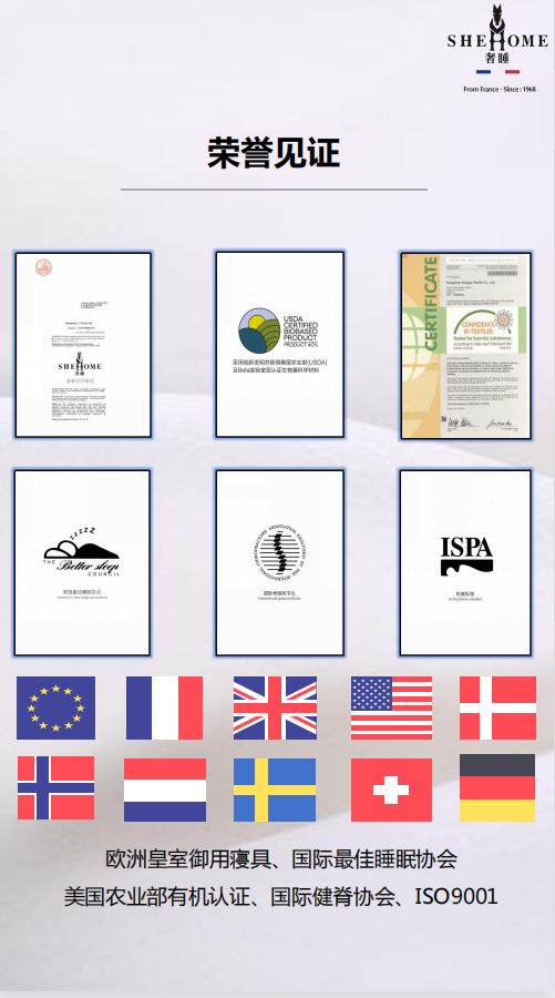 随着品牌在欧洲寝具行业领袖品牌地位的不断加深,2017年3月法国SHEHOME开启了奢睡中国之旅。经过4年的潜心经营,现已形成集生产、设计、销售一体化的高端床垫睡眠品牌。成为拥有2万㎡工业化生产基地,4条现代化流水线,销售网点近300家,销售网络辐射全国20多个省市和地区的知名寝具品牌。2019年,奢睡研发的有机零度枕头,获得了美国农业部有机认证,完美实现了躺下十分钟,深睡8小时睡眠体验。