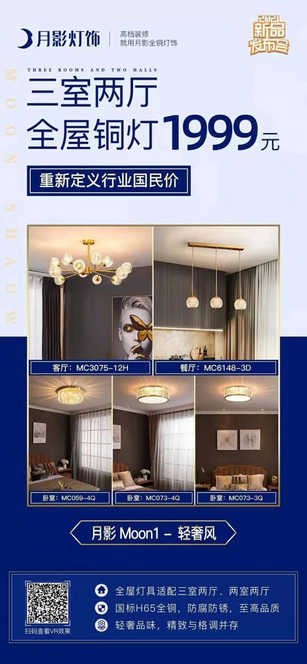 月影全铜灯,家居新饰代!月影家居始终秉承着“让人们的居住环境更加美好”的使命,为客户提供一站式家居照明乃至全屋软装一体化解决方案,满足客户个性化、精品化、一站式订购全屋灯饰的需求,轻松缔造温暖有爱的家居环境。