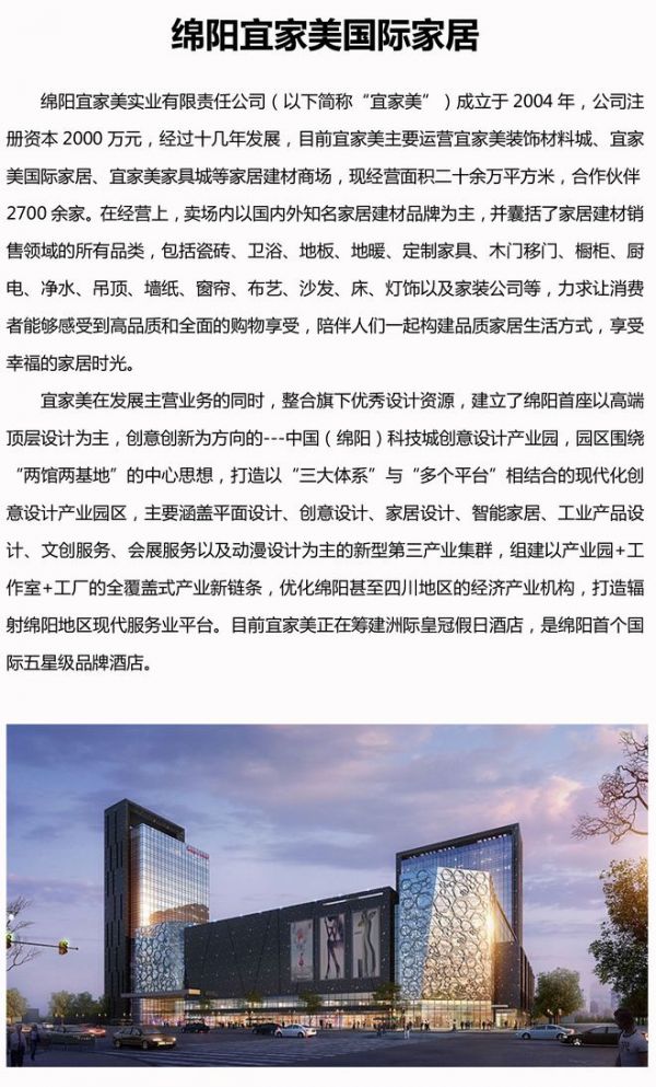 2004年,宜家美装饰城的出现,改变了绵阳家居建材零售的传统状态。4万平方米超大空间,汇集上千种国内外知名建材品牌,开创了绵阳高端家居建材商场化新纪元。