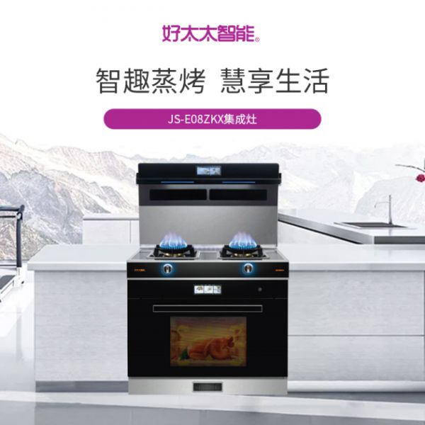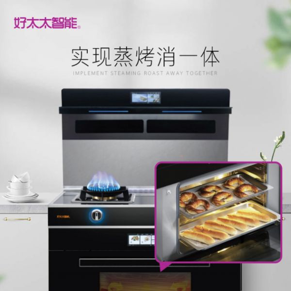 好太太智能集成灶,集合油烟机、燃气灶、电蒸箱、电烤箱、消毒柜、暖菜宝多厨电于一体化设计,实现蒸烤消一体,既节约了厨房空间,又使做饭的人不用打开多个电器,避免了手忙脚乱、焦头烂额,可以更加悠哉悠哉的享受烹饪时的乐趣。比较有意思的是,这台集成灶对厨房小白也是非常友好的,炉火上方配备了智能高清彩屏菜谱,做菜时可以彩屏查看菜谱,可以根据菜谱探索自己不熟悉的美食领域,智能好操控,方便快捷,也因此受到了众多年轻人的喜爱,在市场上的销售量遥遥领先。