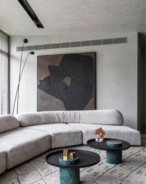 在大面积微水泥肌理下,瞬间渲染出强烈的侘寂美学风格;同时在阳光、花艺、烛台和精致的艺术品陪伴下,也不失情绪和温度。