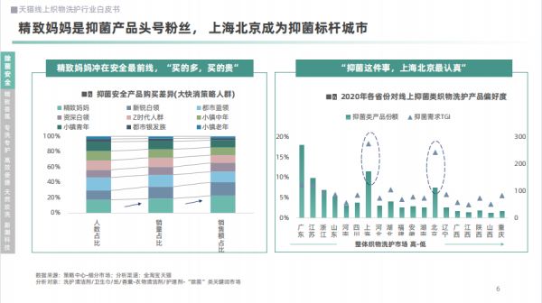 2020年是疫情年也是“抑菌”年,除菌安全需求随疫情爆发而猛增,“消毒”“抑菌”等搜索词首次出现在用户高频搜索词。年轻消费者已经成为线上织物洗护产品的主力消费人群,精致妈妈一跃成为抑菌产品头号粉丝,上海和北京成为抑菌标杆城市。