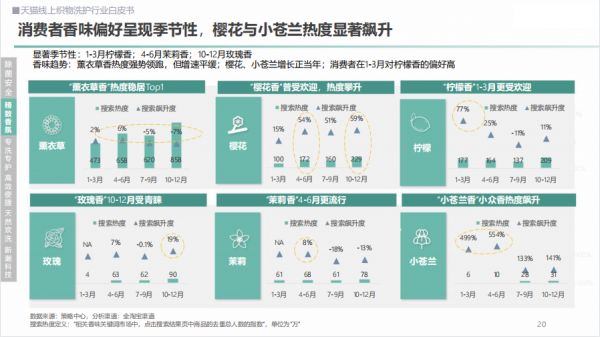 消费者对各类洗护产品的“香氛”需求不断攀升,并且对“香”的需求贯穿整个洗护过程。希望产品本身具有天然香味、温和不刺激,对洗后锁香、持久留香的需求更高。除此之外,消费者香味偏好呈现季节性,樱花与小苍兰热度显著飙升,薰衣草香热度强势领跑,香氛体验助力织物洗护消费升级。