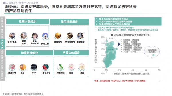 消费者在选购织物洗护产品时受适用人群、使用场景、织物材质、产品功效等特定场景因素影响,更愿意全方位呵护衣物,专注特定洗护场景的产品应运而生,满足细分使用场景的专洗专护成为织物洗护新趋势。