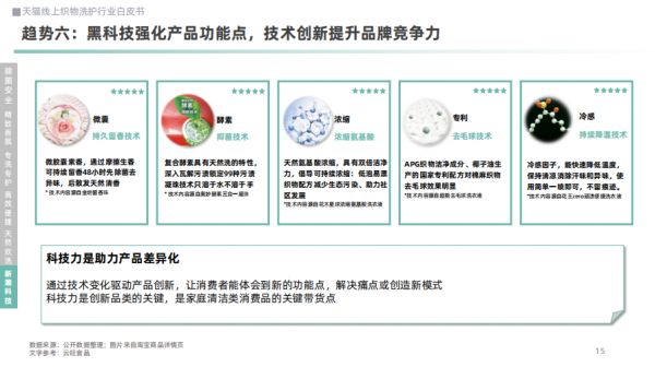 科技力是创新品类的关键,也是家庭清洁类消费品的关键带货点。科技助力产品差异化,“微囊、酵素、浓缩、专利、冷感”等黑科技强化产品功能点,技术创新提升品牌竞争力。通过技术变化驱动产品创新,让消费者能体会到新的功能点,解决痛点或创造新模式。