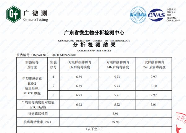近日,玉兰家居委托广东微生物分析检测中心(广微测)将流感病毒接种到测试样品和对照样品上,在24小时后洗出病毒,并用TICD50方法测量具有活性的病毒感染滴度,用滴度对数值之差来表示抗病毒测试样品和对照样品之间减少率,从而确定测试样品的抗病毒性能。检测结果显示,玉兰全新抗病毒功能性墙布(未上市)通过严格检测(详见检测报告)。