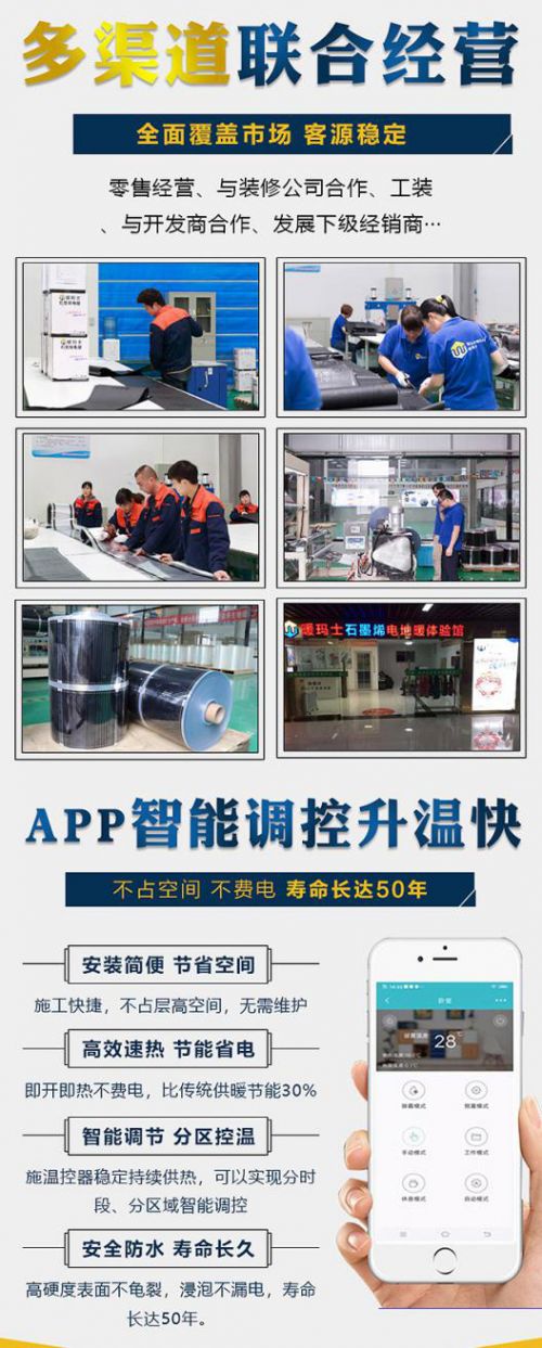 石墨烯是迄今为止科学上发现厚度最薄、强度最大、导电导热性最强的新型纳米材料。亦被称之为“黑金”,是“新材料之王”,将彻底改变21世纪,是一场全球的颠覆性新型技术产业革命。因为超薄的石墨烯远红外发热膜的电热转换率高达99.6%,能够将耗损减到最低,所以暖玛士石墨烯地暖制暖更高效,温暖享不停。同时配合智能温控的调节,更能避免不必要的浪费。电热膜直接将清洁能源电能直接转换成热能,并且工作时无废气,废水,噪音、电磁辐射产生,是真正意义上的绿色环保采暖方式。暖玛士石墨烯地暖,不占层高,安全防水,节能环保,高效供热。暖玛士石墨烯地暖,采暖升级,导电传热快,15-20分钟地表温度达舒适水平,更多家装的选择,带来更多的财富市场,助力财源广进享财富不停。