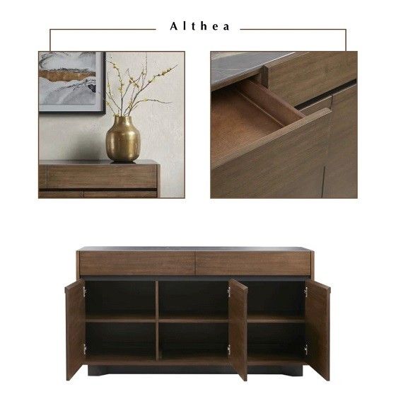 进口意大利岩板被选用于Althea餐边柜的台面上,其经切割、打磨后,表面通透出肆意美丽的花纹,低调地绘制出餐边柜的装饰表情,同时也为台面陈列的摆件提供了丰富的搭配可能。