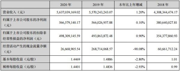 报告显示,2020年度公司实现营业总收入56.37亿元,同比增长1.2%;归属于上市公司股东的净利润5.67亿元,同比增长0.1%;每股收益为1.45元。