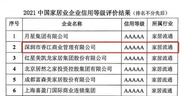香江家居获评“2021家居企业信用评价AAAAA级企业”