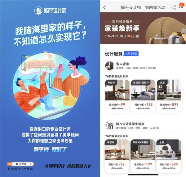 在此背景下,躺平设计家联合天猫在今年3月家装节期间特别推出了“躺平春季家装新品节”、天猫家装城3DMall“设计师专属楼层”、上手淘搜索关键词“躺平设计”等一众对准设计师群体和消费者的活动。