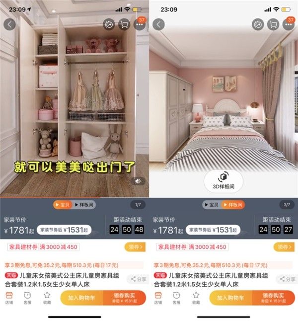 首先,基于躺平设计家正式推出的“3D短视频”技术,不少家居家装商家已经升级了的天猫手淘店铺,在首页和商品页清一色的将3D效果的短视频替代了原来2D图文推荐,并搭配3D样板间展示来吸引消费人群。