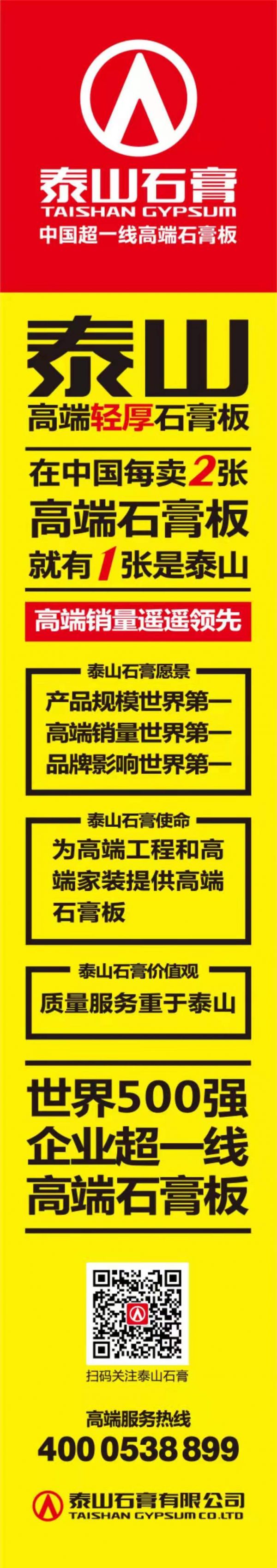 历经50年长足发展,泰山石膏已发展成为国内同行业覆盖地域最广,产能布局最合理,市场占有率最高,竞争力最强的企业。泰山石膏秉承“质量服务重于泰山”核心价值观,在“产品规模世界第一、高端销量世界第一 、品牌影响世界第一”的愿景推动下,致力于为更多高端工程和高端家装提供高端石膏板,成为高端石膏板领导品牌。