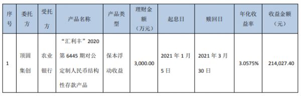 顶固集创家居:使用部分闲置自有资金进行现金管理到期赎回
