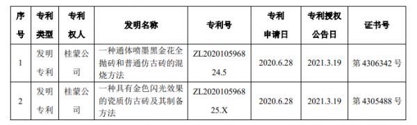 公告显示,公司控股子公司广西蒙娜丽莎新材料有 限公司于近日取得国家知识产权局颁发的发明专利证书 2 项,情况如下: