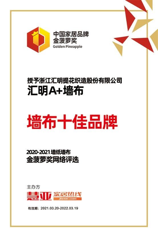 2021年3月31日,在北京举办的2021墙纸墙布发展年会暨中国家居品牌金菠萝奖盛典,汇明A+墙布凭借其过硬的产品质量、丰富的产品品类,还有优质的服务团队荣获“金菠萝奖”2020-2021年度十佳墙布品牌。