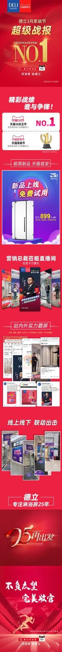 经过前期预热、中期加速和后期集中爆破,德立3月家装节超级战报新鲜出炉,成功斩获天猫定制淋浴房类目销量NO.1,展现出德立品牌的巨大实力和引领风范。