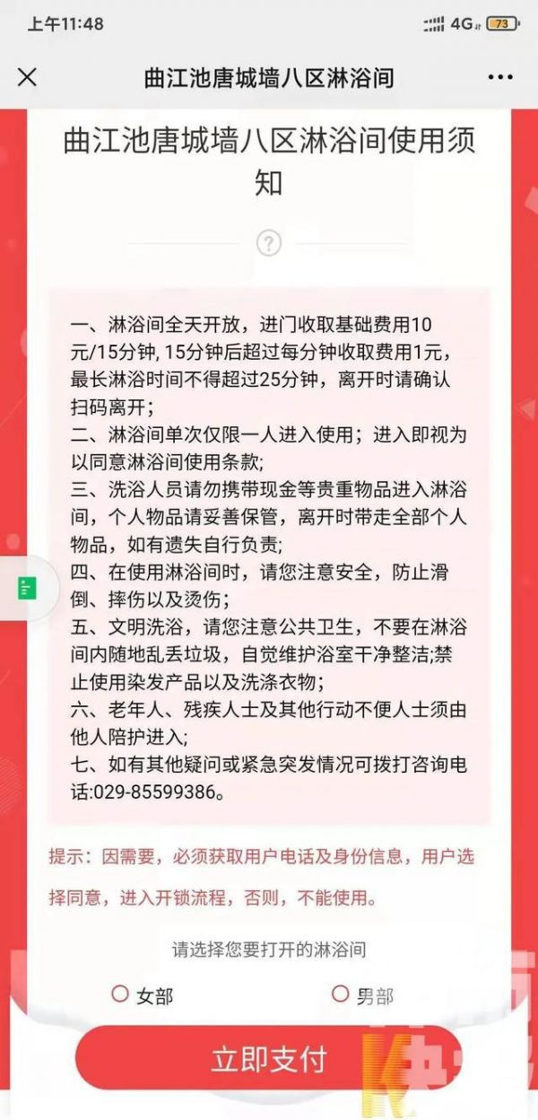 曲江池遗址公园工作人员田睿:“因为整个公园它是以运动为主的,经常在这边有打球的市民游客,为了让他们一个更好的游园体验,在这个城市服务驿站里面增加了淋浴功能。整个淋浴房分为男浴和女浴,男女浴室各有两间。操作方法也非常简单,只需微信扫描二维码进出,然后确认信息就可以正常使用了。”
