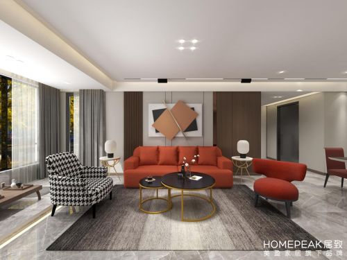 搭配千鸟格沙发椅、日出橙休闲椅,在色调及设计的对撞中,产生别样的热情与时尚感。朴实舒适的质感,让整个空间传递出休闲、宁静的宜居气息。