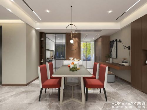 搭配充满香甜气息的绯色餐椅,形成温馨浪漫的靓丽点缀,瞬间提升了空间设计的画面感。简约与功能至上,更适合现代简约风格的家居生活。将“秀色可餐”的餐厅与“利于思考”的书房合二为一,多元化功能使空间兼具轻松与沉稳的双重性。双重空间的设计充满了浓郁的现代生活气息,更为家里带来自在的轻松氛围。