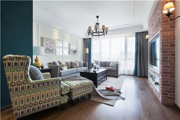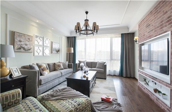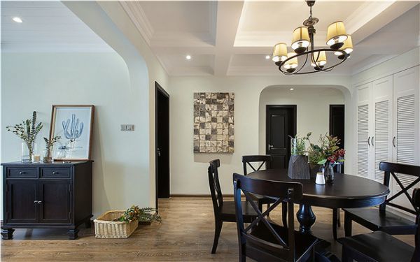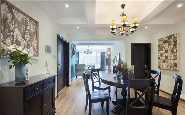 美式,代表的是自由与贵气、进取与传统,汲取美式风格中足够温情的一面,摒弃过于厚重怀旧的形体表现,呈现出的是眼前这个既复古又优雅的家居空间。以米色系墙面为空间定下基调,用简单的线条凸显美式风格,搭配上深色的木质家具以及布艺沙发,鲜明的颜色对比,令空间更显明亮通透。做旧的红砖背景,镂空的雕花装饰镜,带来淡淡的复古韵味,营造出恰到好处的空间层次感和精致感。