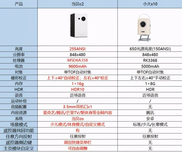 最近数码市场又掀起一场迷你投影仪的大风,以小、微、轻便、时尚为关键词的微型投影仪正对学生党和租房党的下怀,迎来了它们的春天。最近不少人提问,小火投影s10和当贝投影c2该怎么选?其实这两款产品并没有太大的可比性,给你看一张参数表就明白了。