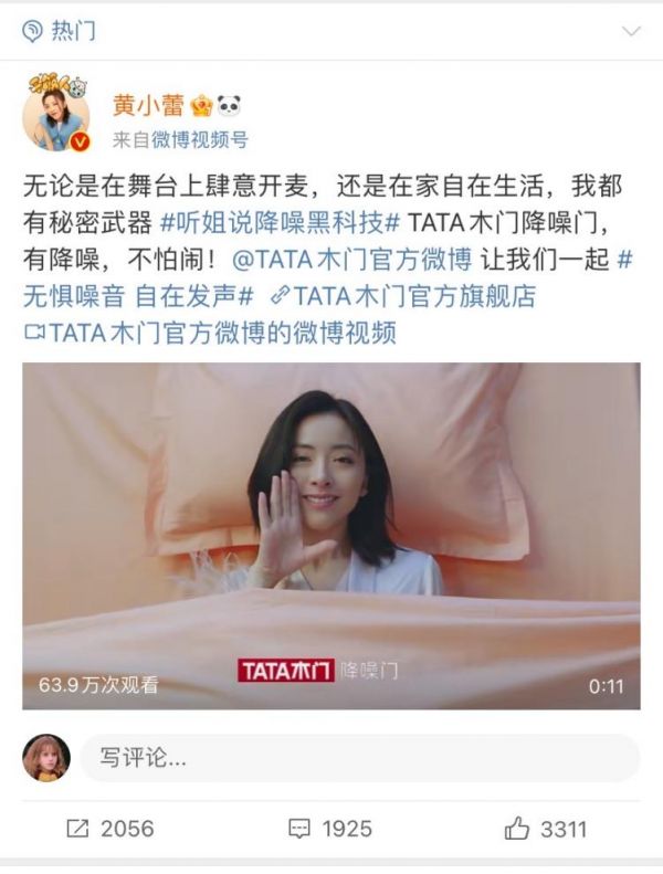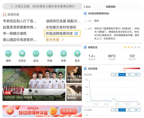 日前,随着《听姐说》节目的播出,#听姐说降噪黑科技#话题冲上微博热搜。话题阅读量达1.4亿次,讨论量近9千次,随着话题热度高涨,大众对首席赞助《听姐说》的家居品牌TATA木门有了更直观的认识,让TATA木门实力在线上圈粉一波。