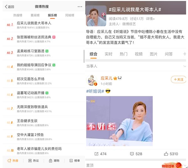 根据受众注意力迁移规律,节目嘉宾是受众注意力的第一落点,赞助品牌伴随节目的播出及嘉宾的话题带动不断吸引注意力资源,斩获流量。因此,既然赞助品牌能够登上热搜,热搜上自然也少不了节目嘉宾的身影。从节目内容来看,“姐姐”们在节目中金句频出,优异的表现也让节目话题不断,节目播出后,18个“姐姐”纷纷登上热搜:#应采儿说我是大哥本人#占据娱乐热搜帮单第1位,#鄂婧文脱口秀天赋#占据第15......