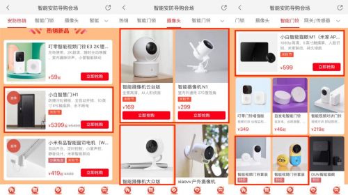 小白智慧门、小白智能摄像机、小白智能摄像机云台版、大众版,以及小白智能猫眼M1、智能视频门铃套装7款产品稳稳霸占了智能安防分会场的C位,凭实力冲上类目热销榜。小白智能猫眼M1甚至一度售罄,不得不补货返场。