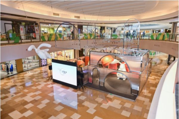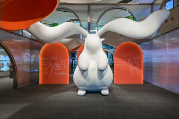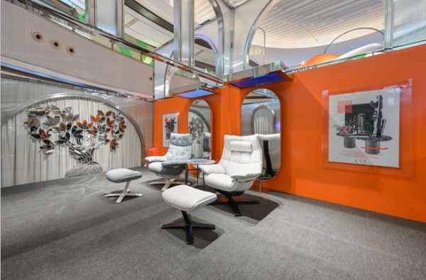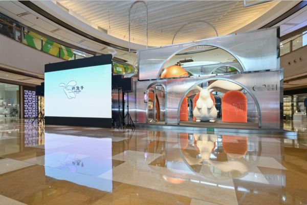 创意家居沙龙现场,Natuzzi Italia 从品牌的中文名发音为灵感,创造出一只有魔力的家居小精灵——“纳兔子”, 它是陪伴你舒适极致的灵感伴侣,魔法精灵;它⽇与夜在你⾝边,想像⼀切能让舒适圈扩大的法⼦。“纳” 有容纳、收纳的意思,在中文中还带有包容、空间等的联想。“纳”, 同时也代表着一种将意式舒适缝进于内的收藏,是Natuzzi Italia始终追求的细节态度,重视生活的所有姿态,以家具为器,将人的极度舒适总和,容纳于内。“纳兔子”全新IP形象的推出,是Natuzzi Italia 试图拉近与年轻消费族群距离的第一步,创意沙龙用跳跃的橙色和精致意式生活代表的Baber Shop(美发沙龙)形式来展示,一只超大的“纳兔子”安坐其中,还有数个小型的“纳兔子”精灵飞于空中,不仅呈现一种年轻的创意碰撞,同时也打造了一种超越于现实的魔法氛围。