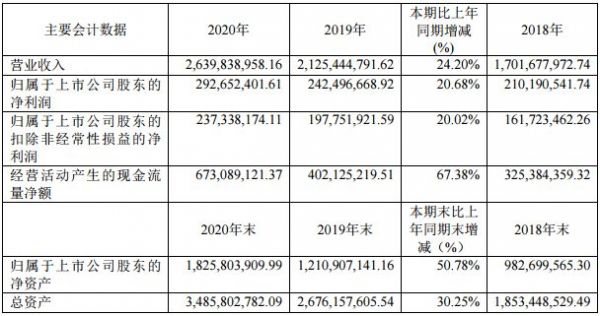 报告称,2020年公司实现营业收入26.40亿元,同比增长24.20%;实现归属于上市公司股东的净利润2.93亿元,同比增长20.68%;实现归属于上市公司股东的扣除非经常性损益的净利润2.37亿元,同比增长20.02%。