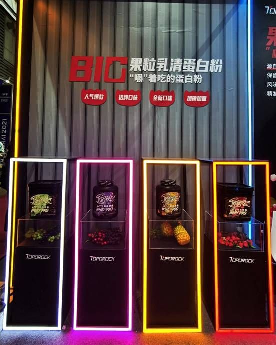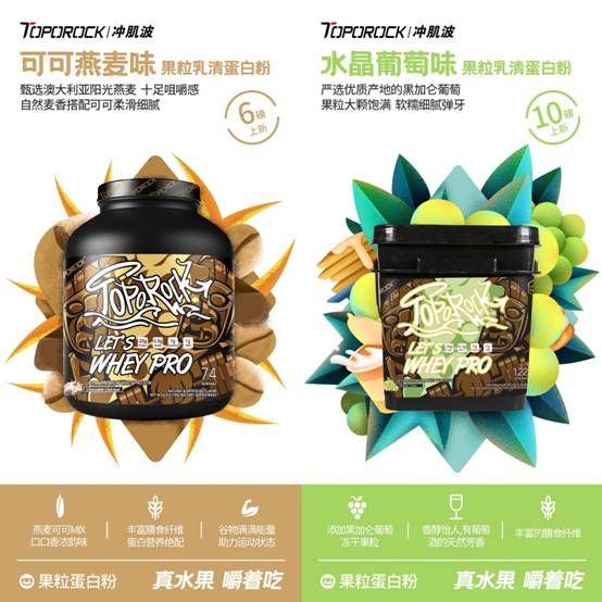 冲肌波于本次展会TOPOROCK冲肌波发布两款新品,分别为果粒乳清蛋白粉10磅水晶葡萄味和乳清蛋白粉6磅可可燕麦味,添加黑加仑葡萄冻干果粒和燕麦谷物颗粒。